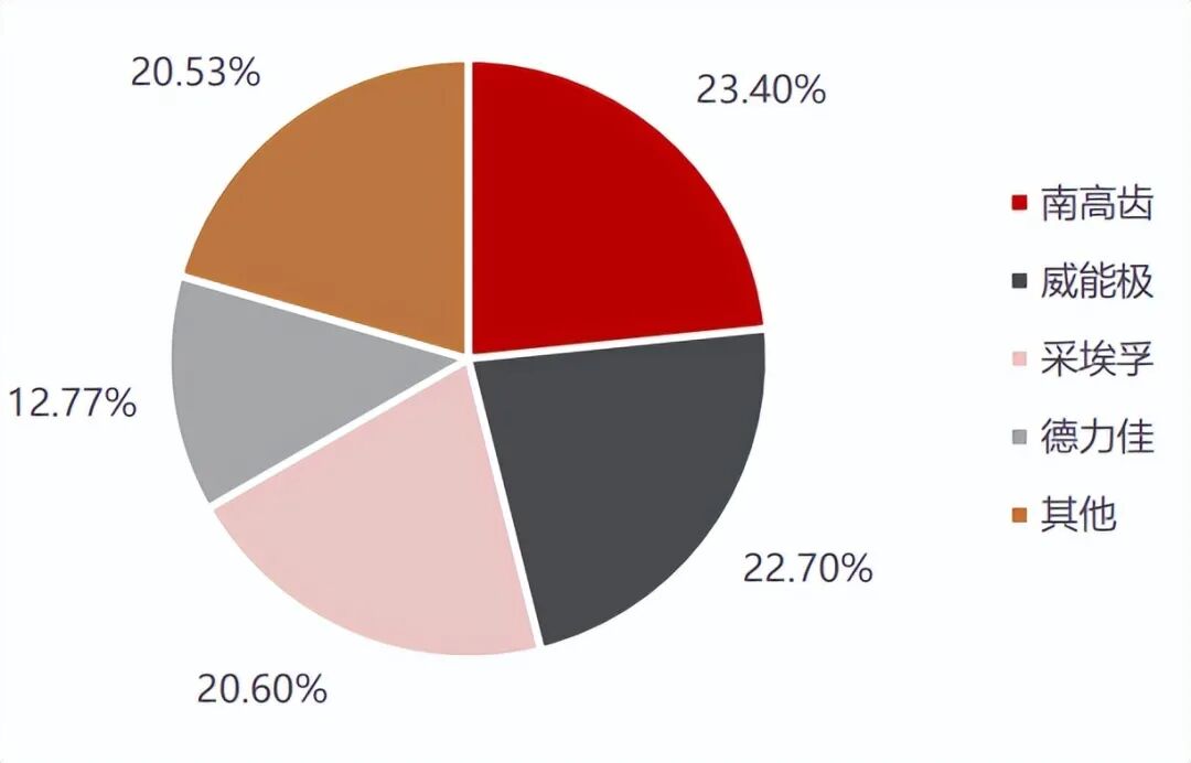 齒輪箱是雙饋式與半直驅(qū)式風(fēng)機(jī)關(guān)鍵部件,成本占比約 15%。齒輪箱位于風(fēng)力渦輪機(jī)的底部,連接著風(fēng)輪(葉片)和發(fā)電機(jī),是風(fēng)力發(fā)電機(jī)組中技術(shù)含量較高的部件之一,在風(fēng)電機(jī)組總成本中占比約15%,僅次于塔筒和葉片。齒輪箱核心作用是將風(fēng)輪葉片的旋轉(zhuǎn)動(dòng)力轉(zhuǎn)化為高速旋轉(zhuǎn)和適當(dāng)?shù)呐ぞ兀则?qū)動(dòng)發(fā)電機(jī)產(chǎn)生電能。齒輪箱通常由多個(gè)齒輪組成,通過精準(zhǔn)的傳動(dòng)比例來提高風(fēng)輪轉(zhuǎn)速,并將其轉(zhuǎn)化為適合發(fā)電機(jī)工作的轉(zhuǎn)速。通常風(fēng)輪的轉(zhuǎn)速很低,遠(yuǎn)達(dá)不到發(fā)電機(jī)發(fā)電所要求的轉(zhuǎn)速,必須通過齒輪箱齒輪副的增速作用來實(shí)現(xiàn)。